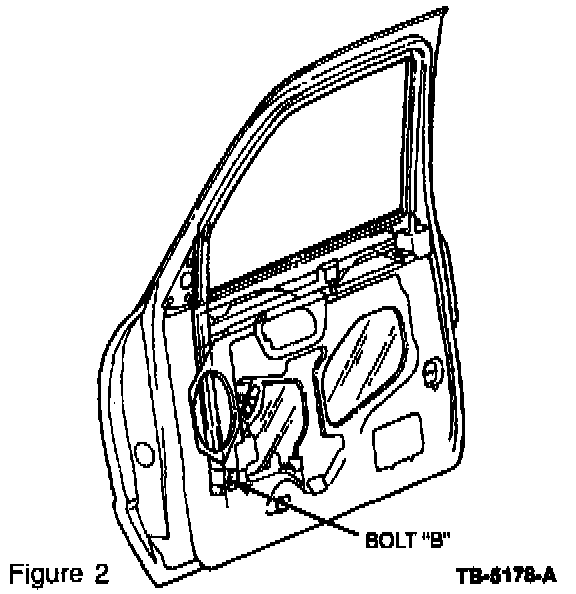 4. Lower the window down to the fully opened position. Then remove the forward glass run attachment (Figure 2, Bolt B).