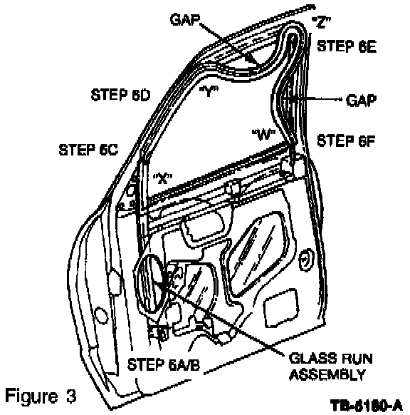 6. Install the revised Glass Run Assembly (F77Z-1021546-BA RH, and/or F77Z-1021547-BA LH) to the door per the following procedure (refer to Figure 3):