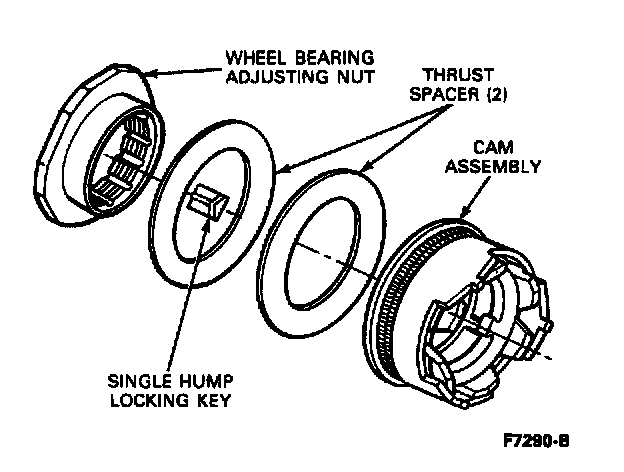 6. Being careful not to damage the plastic moving cam or thrust spacers, pull cam assembly off the wheel bearing adjusting nut and remove the two plastic thrust spacers from the adjusting nut.