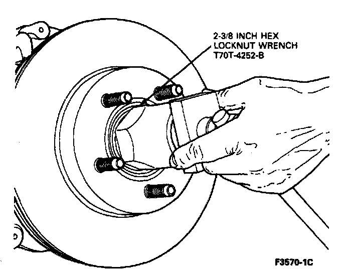 8. Loosen the wheel bearing adjusting nut from the spindle using a 2-3/8 inch Hex Locknut Wrench T70T-4252-B or equivalent.