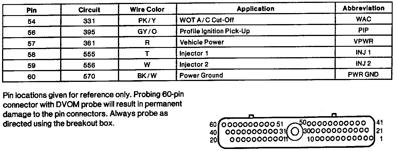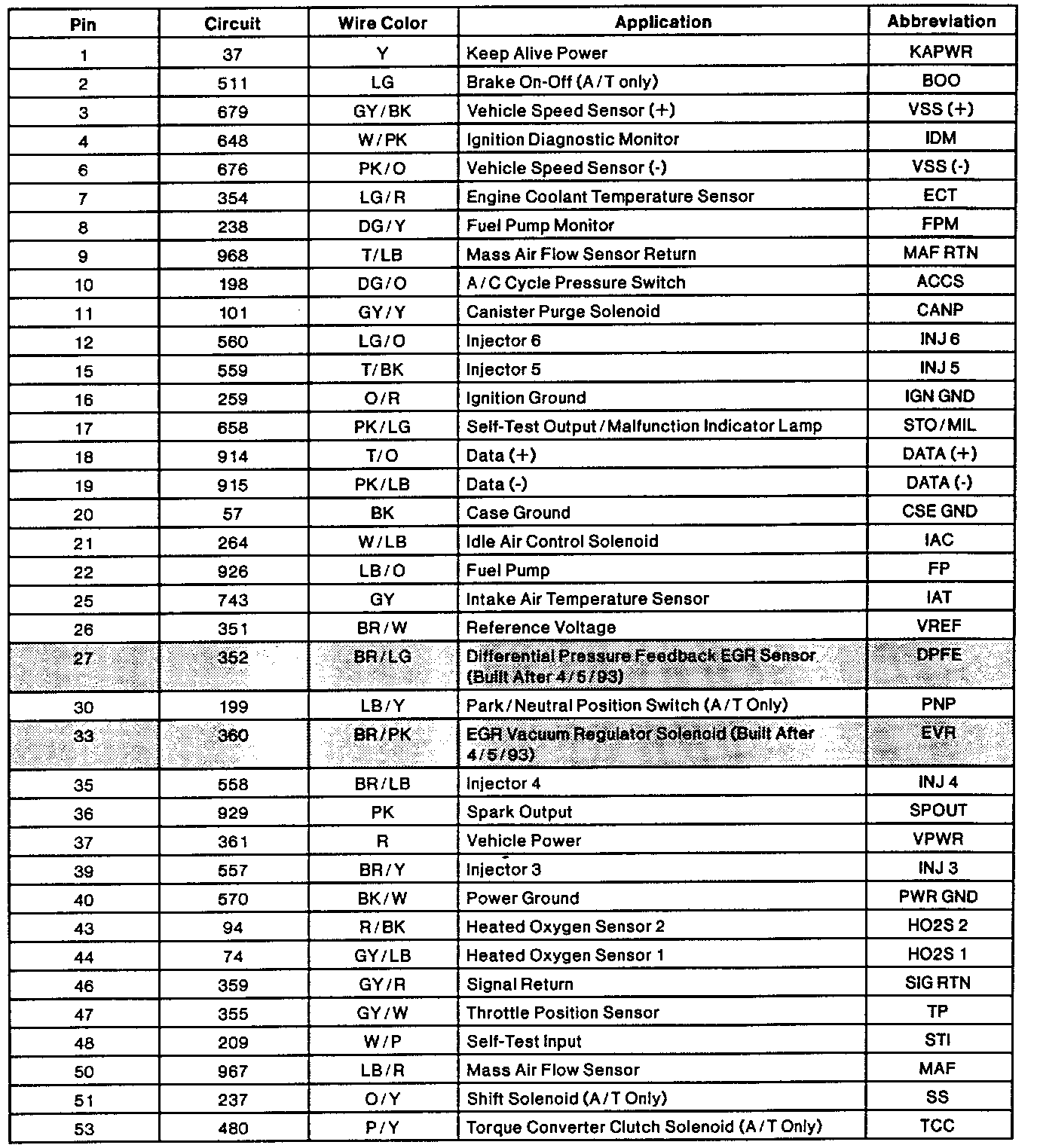 Powertrain Control Module (PCM) Connector Pin Useage: