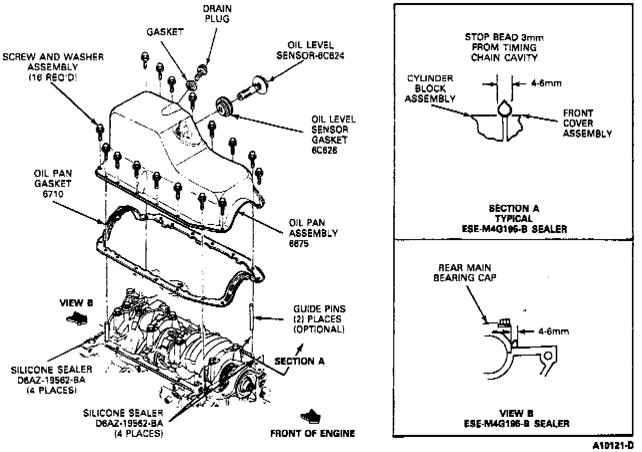2. Apply a 4.0-6.0 mm (1/5 inch) bead of Silicone Sealer D6AZ-19562-AA or BA (ESB-M4G9Z-A), or equivalent to the junction of the rear main bearing cap and cylinder block and junction of the front cover assembly and cylinder block.