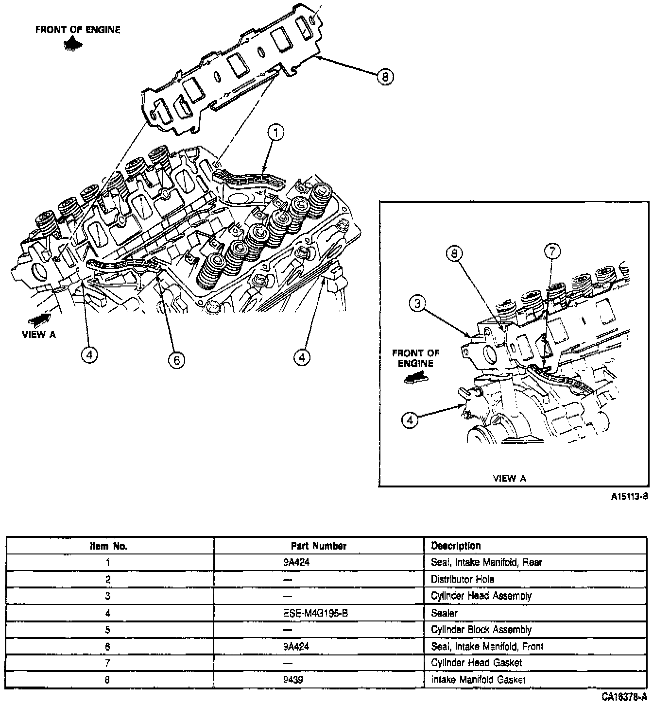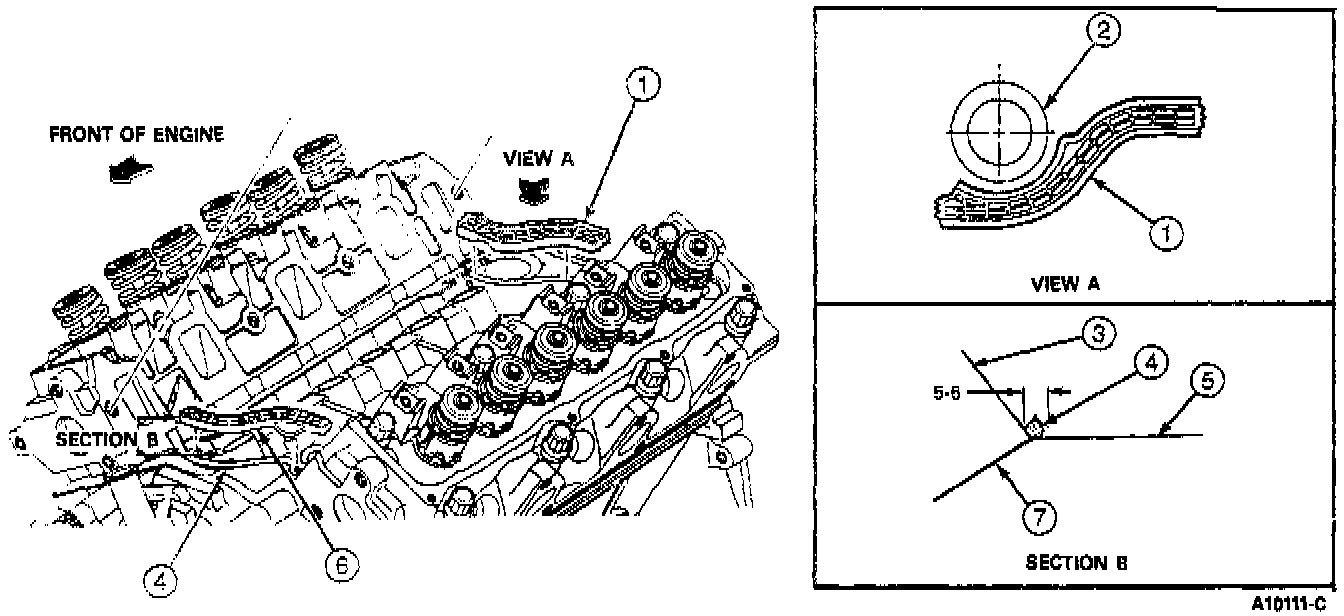 3. Apply a 5-6 mm drop of Rubber Sealer D6AZ-19562-AA or -BA or equivalent to intersection of cylinder block and cylinder head assembly at four corners as shown in the illustration.