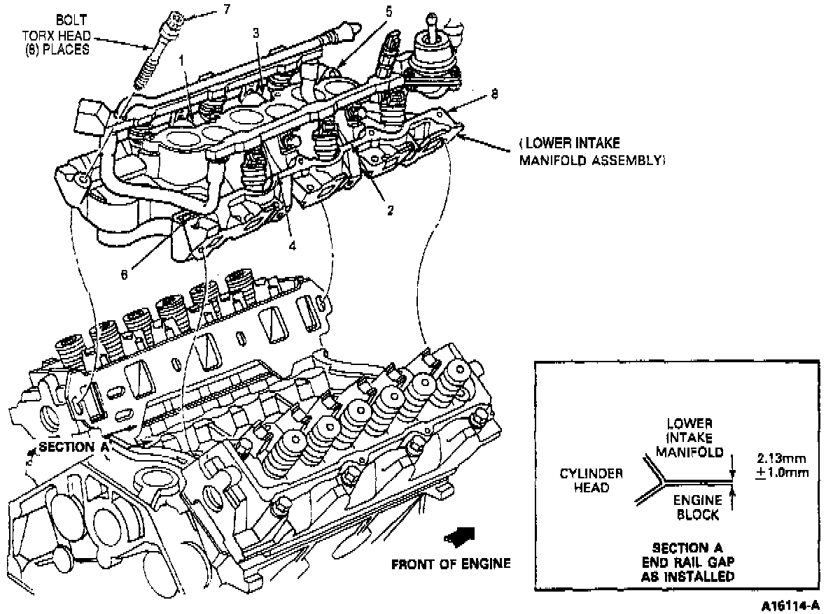 19. Remove intake manifold retaining bolts using a Torx head socket. Before attempting to remove intake manifold, break the seal between the manifold and cylinder block. Wedge a large screwdriver or similar heavy duty tool between the manifold and the block. Pry upward on the tool using the lug on top of the front cover as a leverage point. Removal of alternator may be required for this step. Use care to prevent damage to machined surfaces.