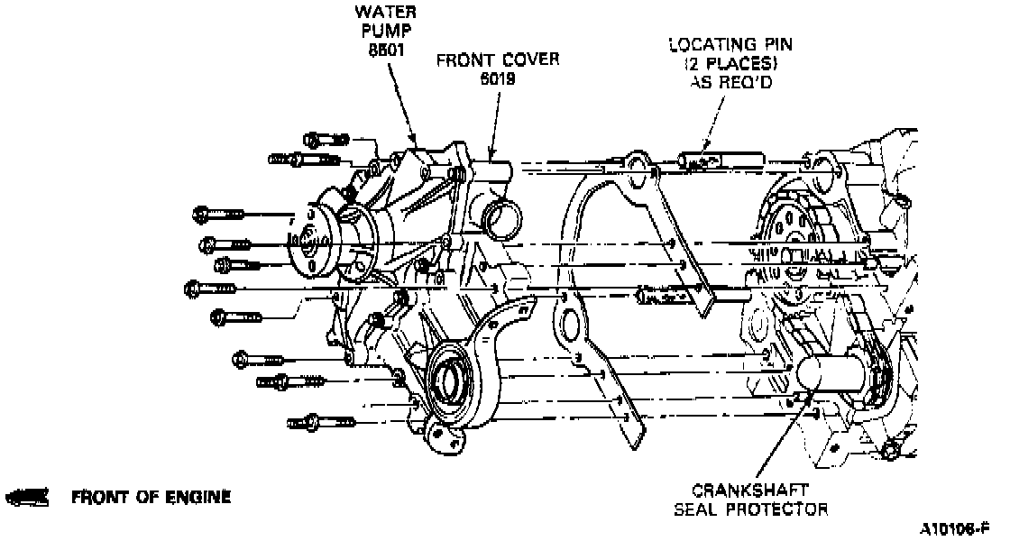 NOTE: Timing cover may be removed with water pump intact. To perform this operation, do not remove bolts numbered 11 through 15 on the Front Cover, Water Pump Fastener Chart.