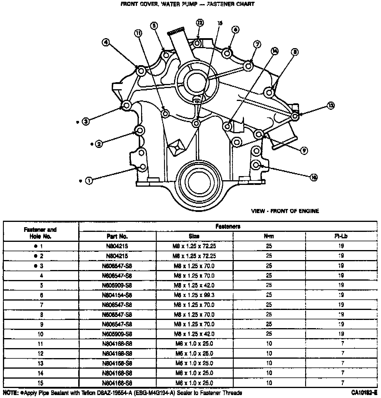 4. Install timing cover and new gasket. Note bolts that require pipe sealant on accompanying chart.