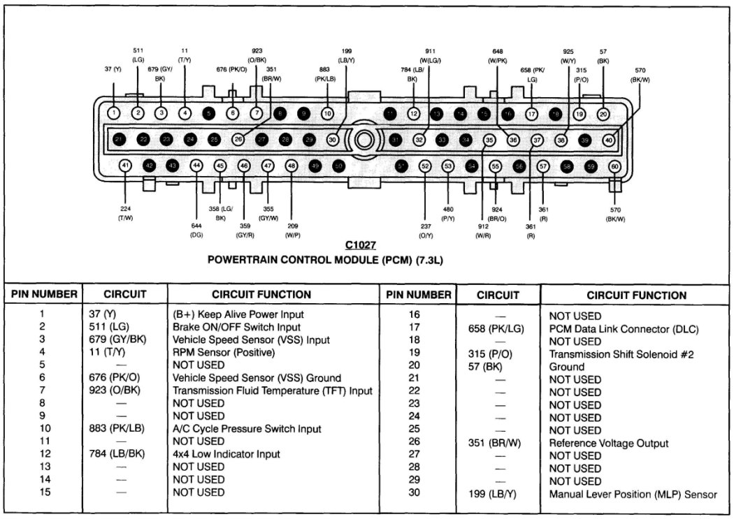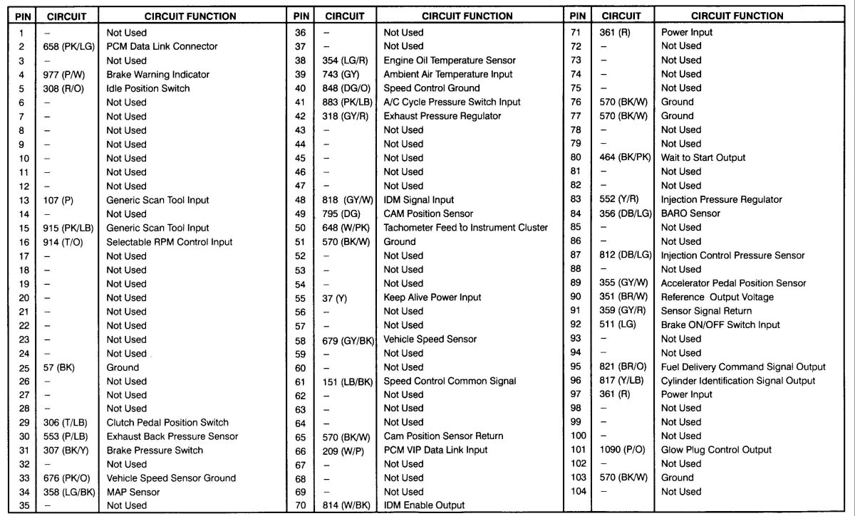 PCM Pinout Chart for 7.3L IDI DIESEL (VIN K)