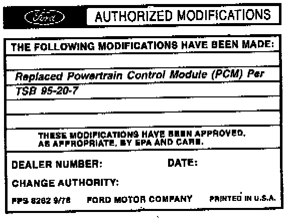 Obtain an Authorized Modifications Decal and list the date, dealer number, and summary of modifications performed. Select a prominent place adjacent to the Vehicle Emission Control Information Decal suitable for installing the Authorized Modifications Decal. Clean the area, install the decal, and cover it with a clear plastic decal shield.