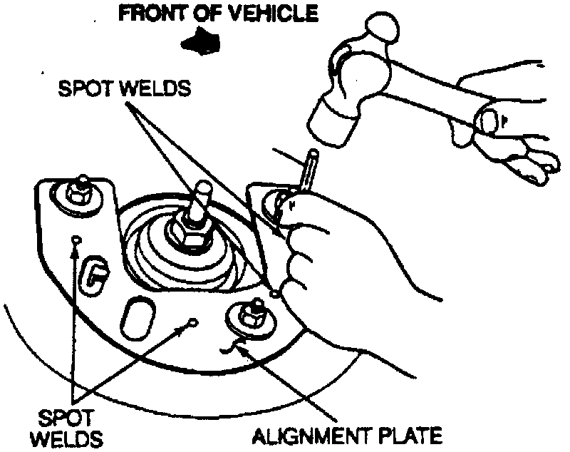 2. Center punch spot welds on both strut alignment plates, then loosen strut attaching nuts, Fig. 1.