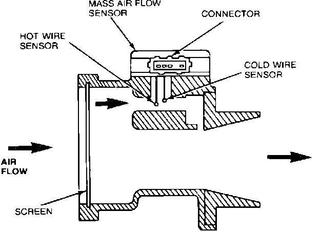 The sensor output is a DC (analog) signal ranging from 0.5 to 5.0 volts used by the Powertrain Control Module (PCM) to calculate fuel injector pulse width for stoichiometry (14.7 to 1). The "hot wire" is maintained at 392°F (200°C) above ambient temperature as measured by a constant "cold wire".