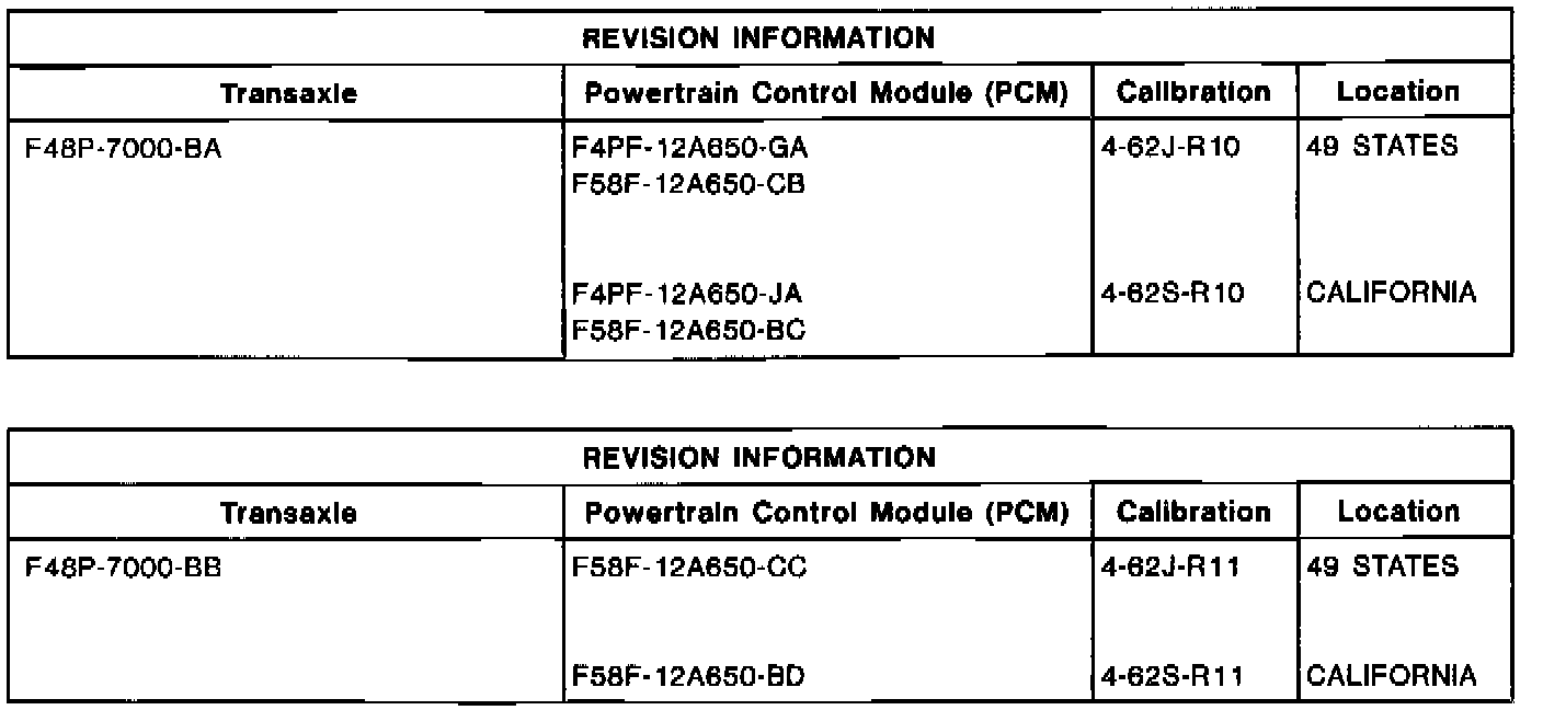 Calibration revisions have been made from R10 to R11, as of August 5, 1994. This level change includes Powertrain Control Module (PCM) calibration and revisions to some internal transaxle components. Therefore, the proper transaxle and Powertrain Control Module (PCM) combination is essential.