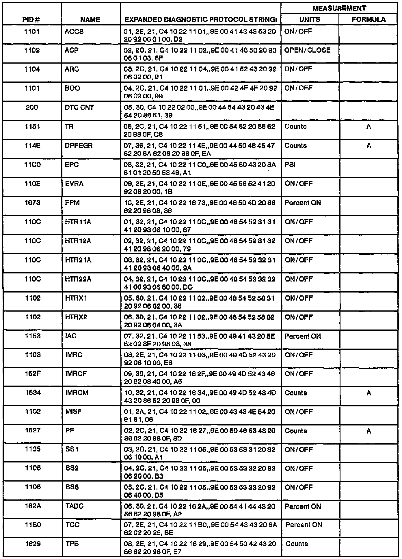 The table lists the string of characters entered in a generic scan tool when accessing enhanced diagnostic Parameter Identification (PID) that may not be common on all OBDII vehicles.