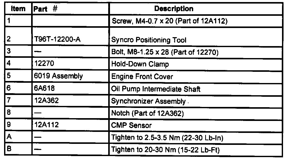 CAUTION: If the replacement synchronizer assembly sensor housing does not contain a plastic locator cover tool, a special service tool such as Syncro Positioning Tool T96T-1 2200-A, one must be obtained prior to installation of the replacement synchronizer assembly. Failure to follow this procedure will result in improper synchronizer assembly alignment. This will result in the fuel system being out of time with the engine, possibly causing engine damage.