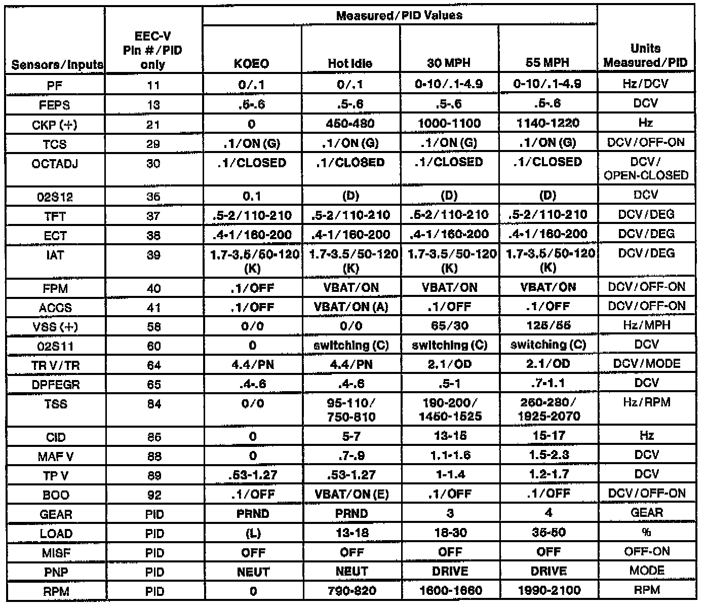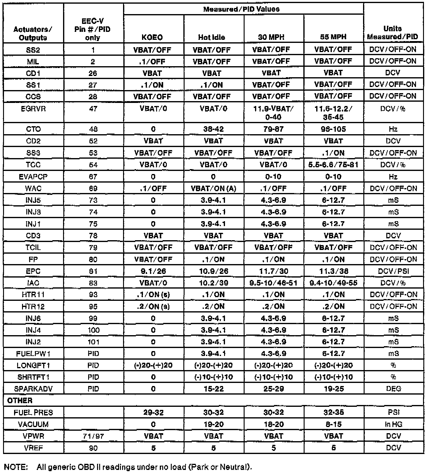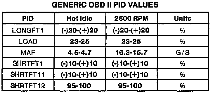 NOTE: All generic OBDII readings under no load (PARK or NEUTRAL).