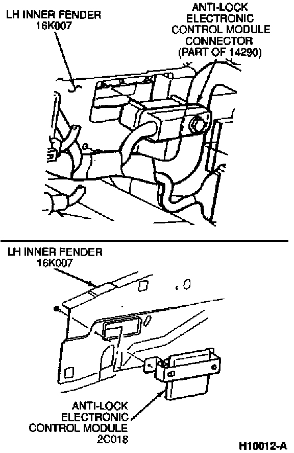 2. From beneath the battery tray (10732), disconnect the electrical connector from the anti-lock brake control module (2B373).