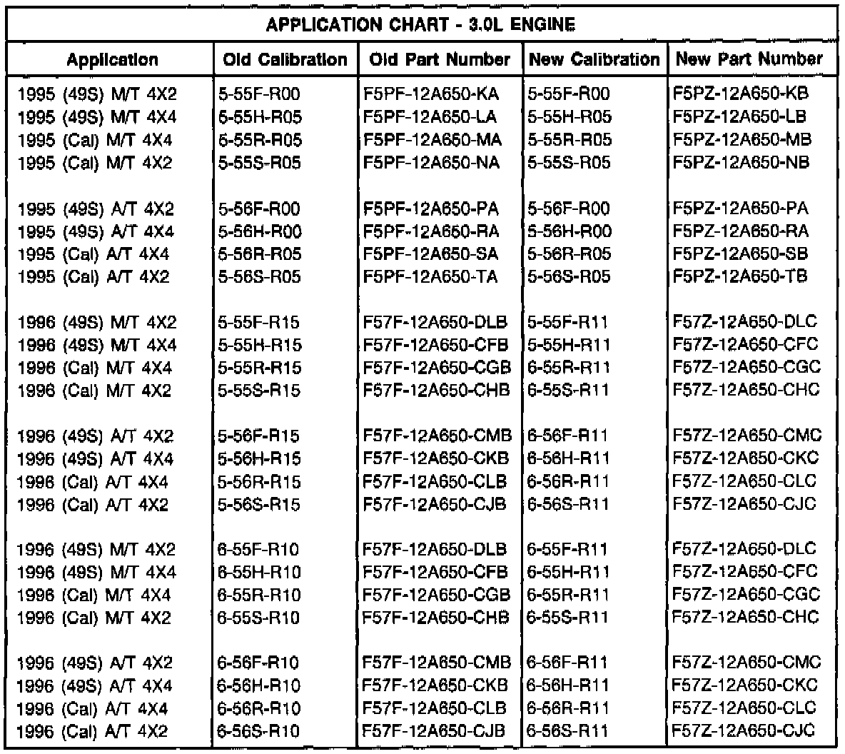 2. If the concerns still exist, reprogram the PCM by following Service Bay Diagnostic System (SBDS) reprogramming tool, April 1996 CD-ROM or later. If SBDS is not available, replace the PCM. Dealers with SBDS are required to reprogram the PCM with the appropriate calibration per the Application Chart. Only non-SBDS dealers are permitted to replace the PCM. Refer to the Application Chart for correct calibration or part number.