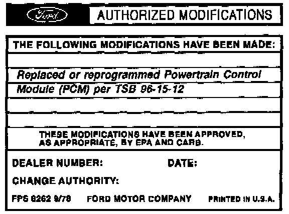 Obtain an Authorized Modifications Decal and list the date, dealer number, and summary of modifications performed. Select a prominent place adjacent to the Vehicle Emission Control Information Decal suitable for installing the Authorized Modifications Decal. Clean the area, install the decal, and cover it with a clear plastic decal shield.