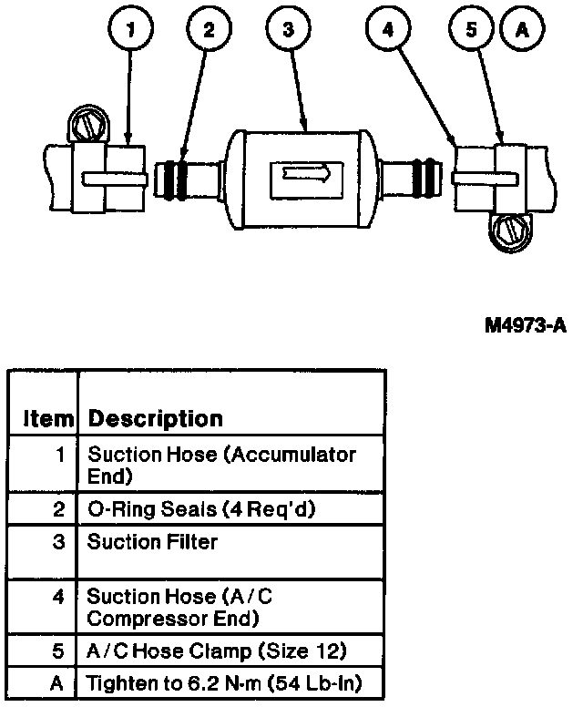 11. Remove a length of suction hose (close to the compressor end) to accommodate the suction filter and install the filter, using A/C hose clamps. Be sure filter is correctly oriented for refrigerant system flow. Check the label on the filter. The size 12 clamps must be positioned over the O-ring seals on the end tubes and tightened to 6.2 N.m (54 lb-in).