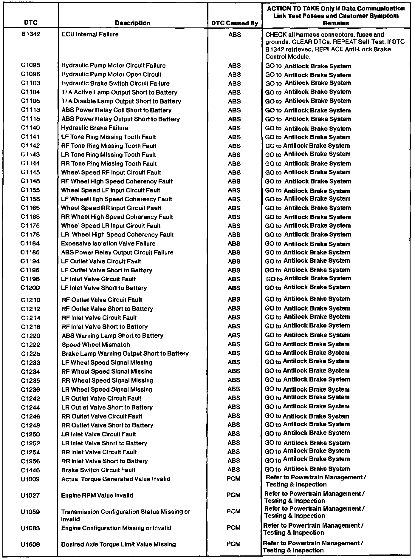Anti-Lock Brake/Traction Control Module DTC Index