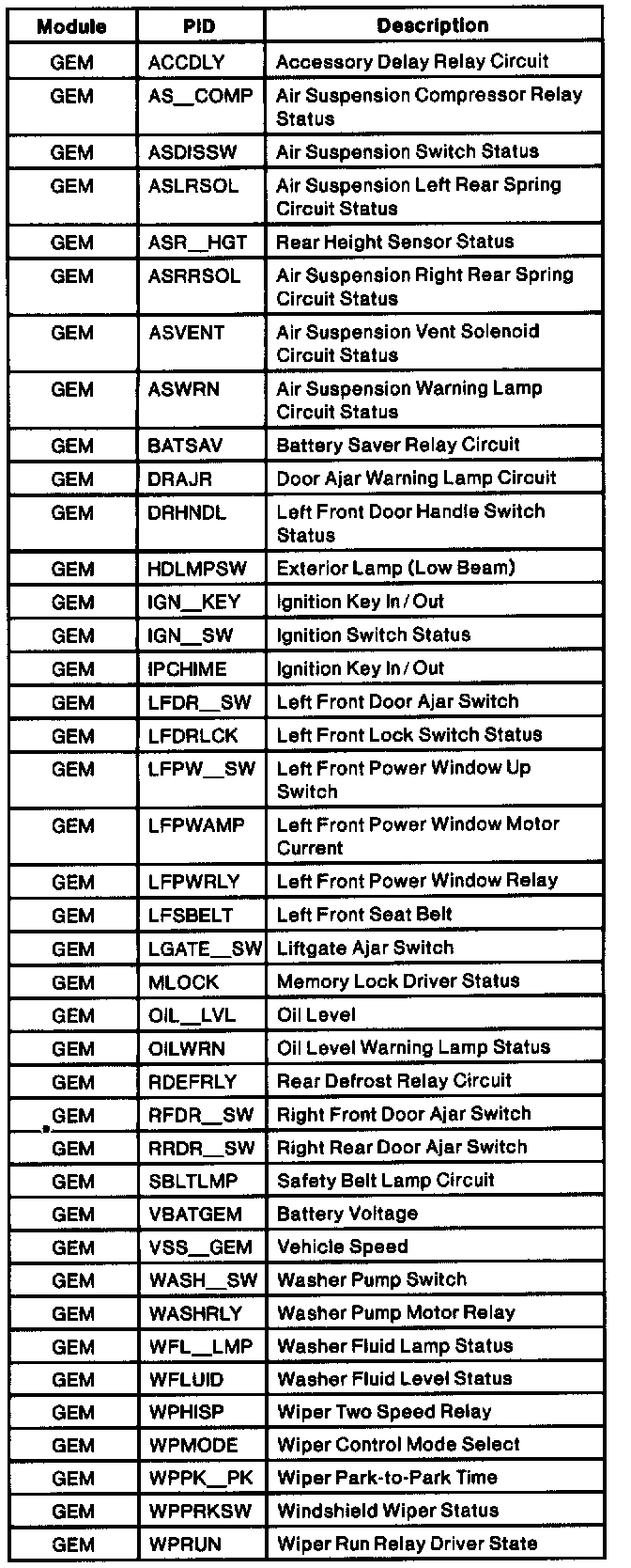 Pinout Values and Diagnostic Parameters