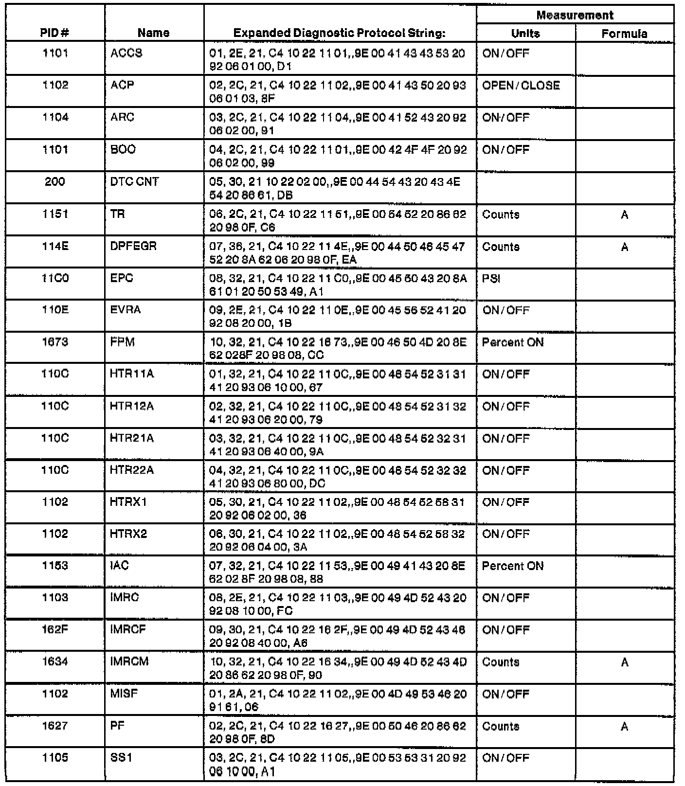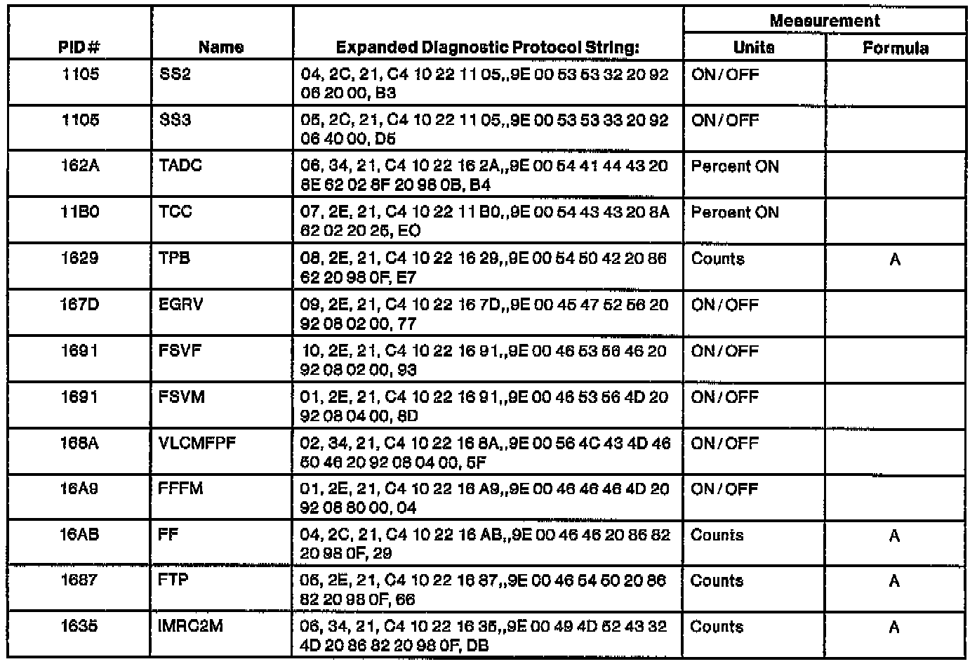The table lists the string of characters entered in a generic scan tool when accessing the enhanced diagnostic PID information that may not be common on all OBD II vehicles.