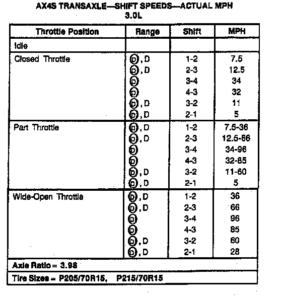 AX4S 4-spd A/T, Shift Speeds (3.0L Windstar):