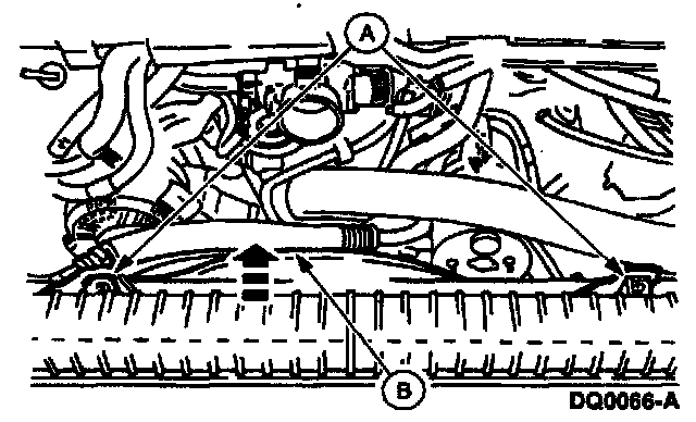7. Remove the (A) bolts and lift the (B) fan shroud, fan and fan clutch from the vehicle.