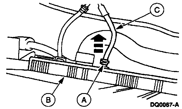 9. Compress the (A) clamps and slide away from the (B) radiator. Twist the (C) transmission oil cooler hoses and remove from the radiator.