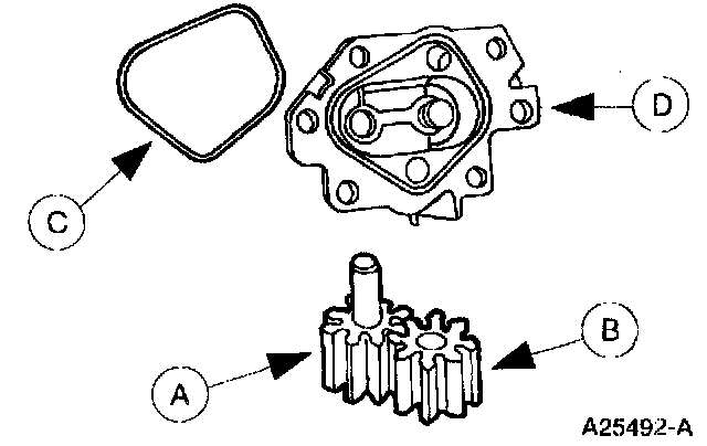 4. Remove the (A) oil pump drive gear, (B) oil pump driven gear, (C) oil pump O-ring seal and (D) oil pump and filter body. Discard the (C) oil pump O-ring seal.