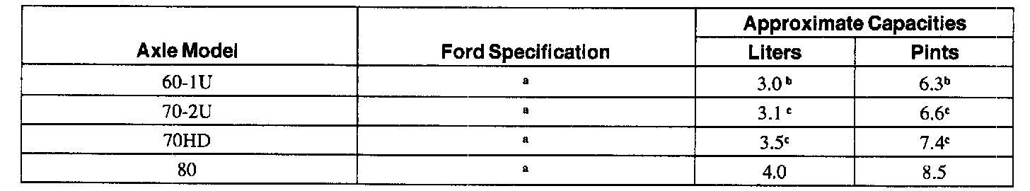 c For a complete refill on Model 70 axles equipped with a limited-slip differential, add 0.163 L (5.5 ounces) of Additive Friction Modifier C8AZ-19B546-A or equivalent meeting Ford specification EST-M2C118-A.