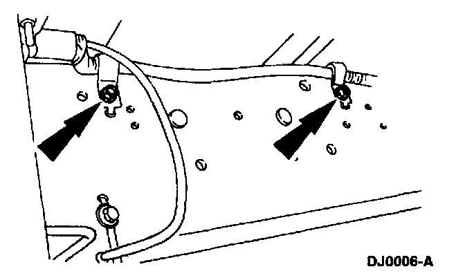 7. Install the two auxiliary or secondary battery cable harness to frame retaining screws.