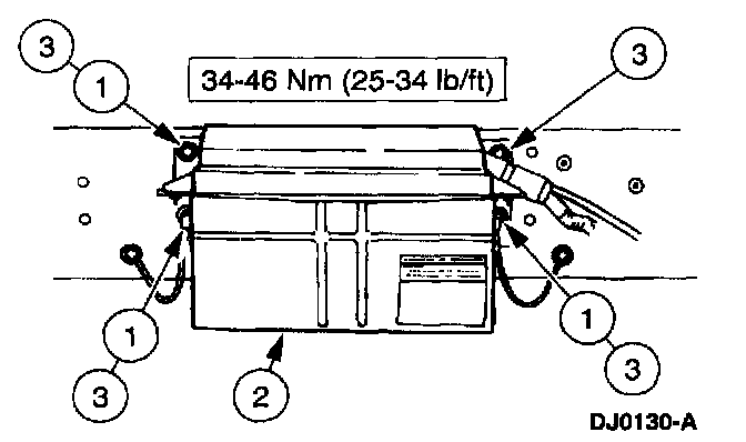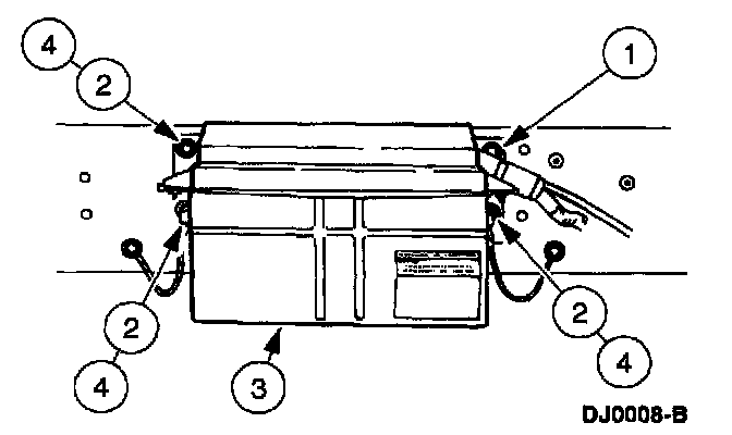 ^ KEEP BODY FROM UNDER THE AUXILIARY OR SECONDARY BATTERY WHEN DISCONNECTING OR RECONNECTING THE AUXILIARY OR SECONDARY BATTERY SAFETY STRAPS SINCE THE BATTERY WEIGHS 50 POUNDS AND BODILY INJURY CAN RESULT.