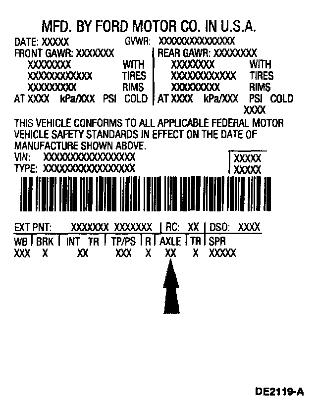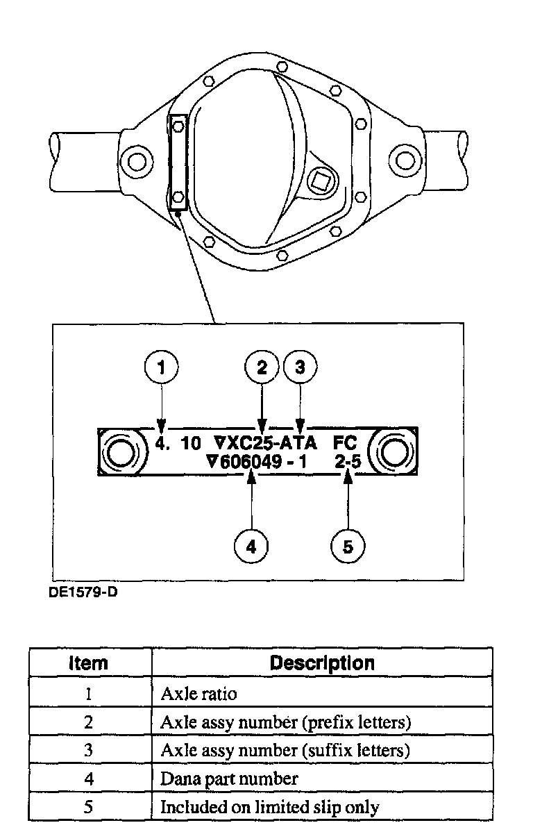 The axle identification tag identifies a particular axle design, a specific ratio, and if it is a conventional or limited slip (Traction-Lok (R)) type. In addition, the plant code will not change as long as that particular axle assembly never undergoes an external design change. If, however, an internal design change takes place during the production life of the axle and that internal change affects parts interchangeability, a dash and numerical suffix is added to the plant code. This means that as an assembly both axles are interchangeable; however, internally they are different. Therefore, each requires different internal parts at the time of repair.