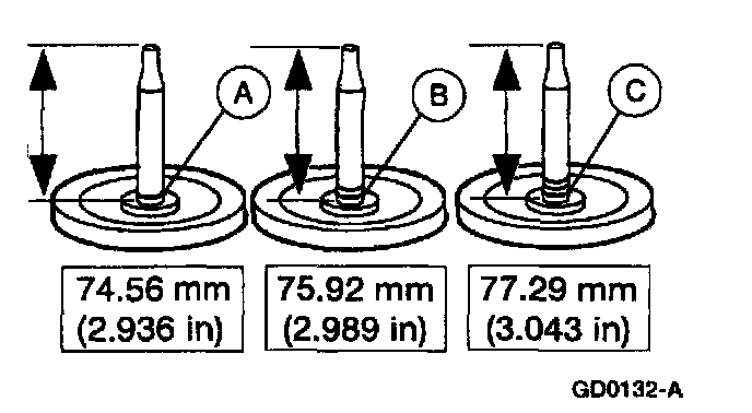 6. If piston travel is not within specification, select the proper servo assembly (A) one groove, (B) two groove or (C) three groove, to bring the servo piston travel within specification.