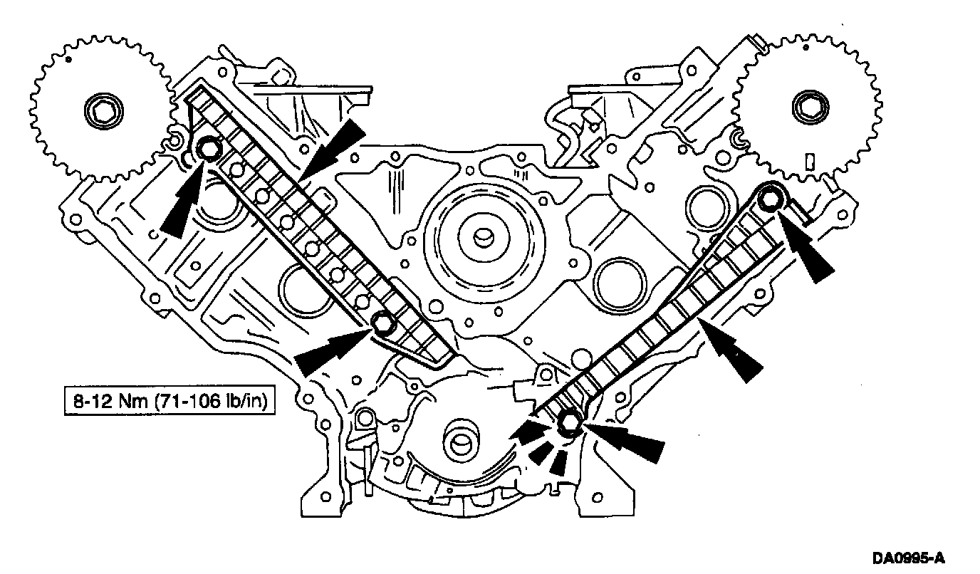 14. Position the LH and RH timing chain tensioner arms on the dowel pins. Position the timing chain tensioners and install the bolts.