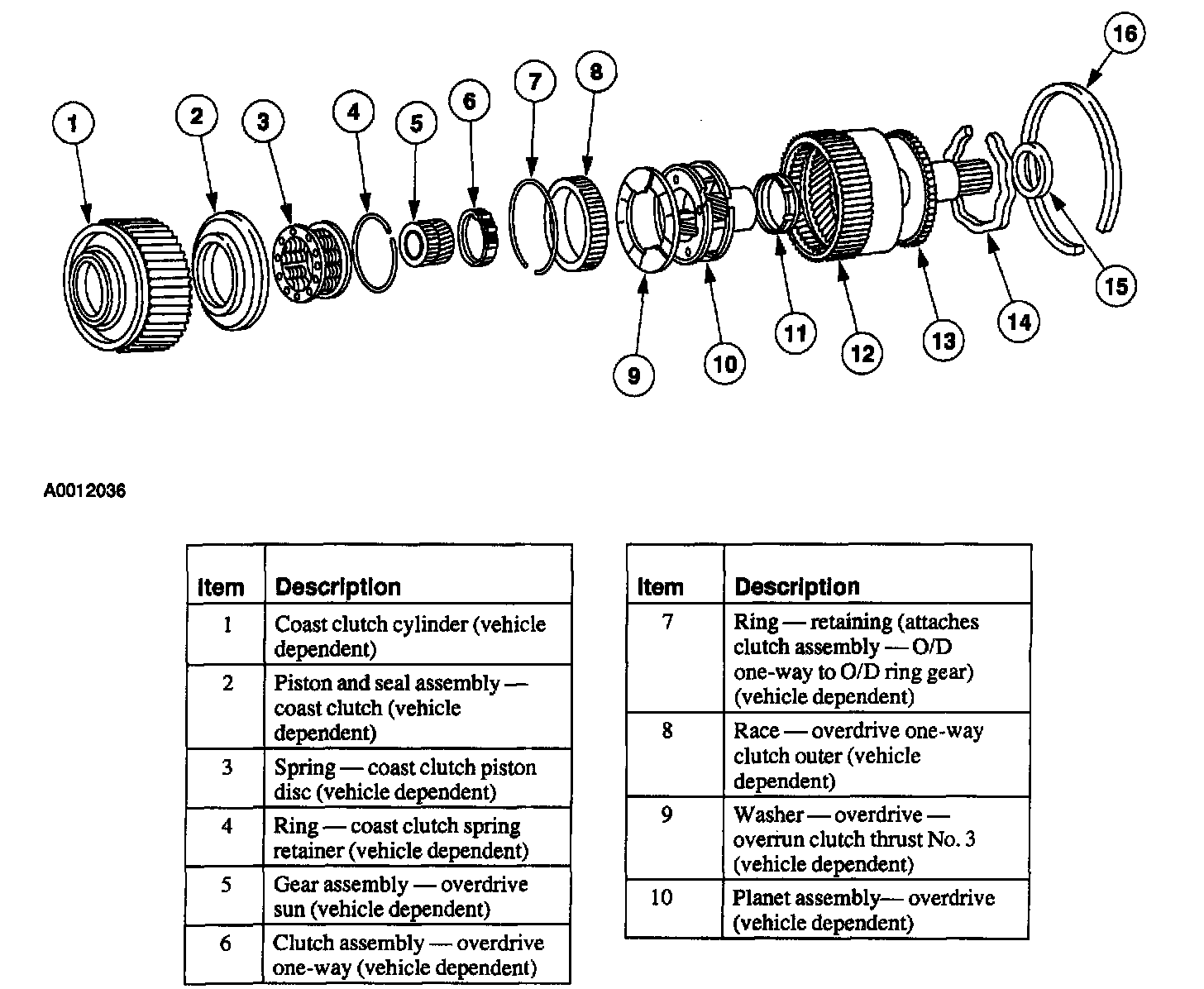 Two friction clutches are assembled in the overdrive planet assembly. The coast clutch is splined between the coast clutch cylinder and the overdrive ring gear. The coast clutch is activated to perform engine braking in MANUAL 1, MANUAL 2 and third gear with the transmission control switch engaged.