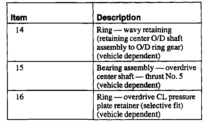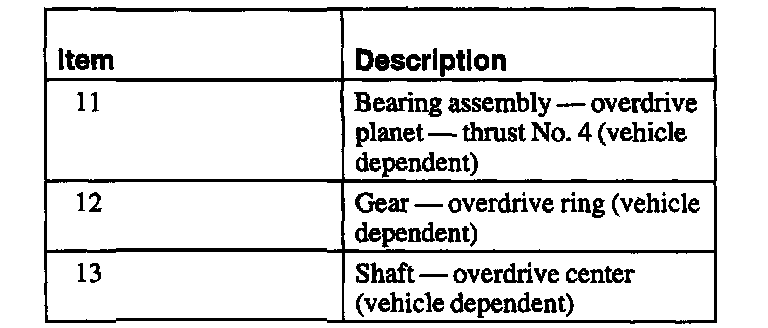 The overdrive planetary system consists of the overdrive planet assembly, overdrive sun gear, overdrive ring gear, coast clutch cylinder, overdrive one-way clutch assembly and the center shaft, as shown in the following illustration. The overdrive planet assembly is splined to the input shaft. The overdrive sun gear is centered by a bushing on the input shaft and held in place laterally by needle bearings on the reactor support and the overdrive planet assembly. The overdrive sun gear is splined to the coast clutch cylinder, which in turn is splined to the overdrive one-way clutch inner race.The outer race of the one-way clutch is splined to the overdrive ring gear, which is splined to the center shaft. The center shaft is centered by the forward planetary assembly and is laterally held by needle bearings on the center support and the overdrive planet assembly. The center shaft is splined into the forward clutch cylinder.