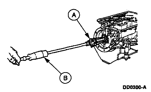 2. Place the other portion of the (A) Rear Case Bushing Replacer and the (B) 127 mm (5 inch) Threaded Drawbar through the case and into the front case bushing.