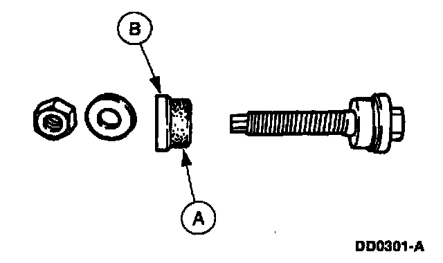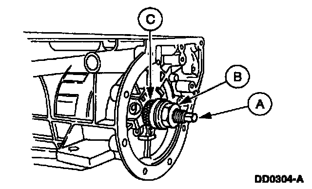 4. Hold the (A) drawbar with a 1/2-inch wrench while turning the (B) nut with a 1-1/8-inch wrench until the (C) rear case bushing is fully seated. Remove the tools.