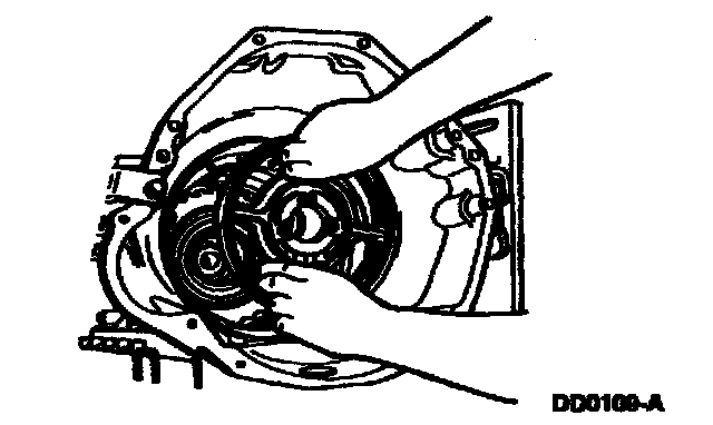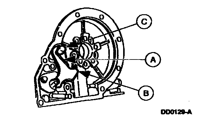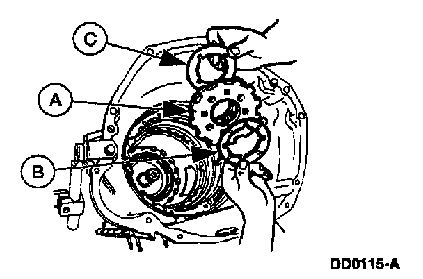 Remove the (A) intermediate clutch pressure apply plate. the (B) intermediate clutch pack and the (C) intermediate clutch rear pressure plate.