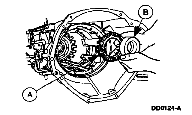 43. Remove the (A) reverse clutch return spring assembly and the (B) low/reverse one-way clutch inner race.