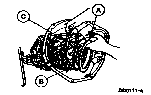 32. Remove the (A) reverse planet assembly with the (B) No. 1OB and (C) No. 11 reverse planet carrier thrust washers.