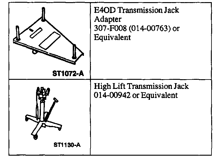 13. Remove the (A) Highlift Transmission Jack with the (B) E40D Transmission Jack Adapter from the (C) transmission.