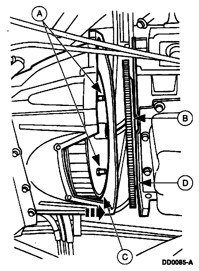 Align the (A) torque converter studs with the mounting holes in the (B) flexplate. Install the (C) transmission to the (D) engine.