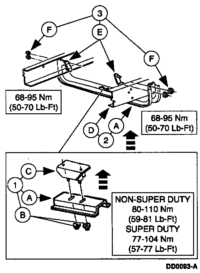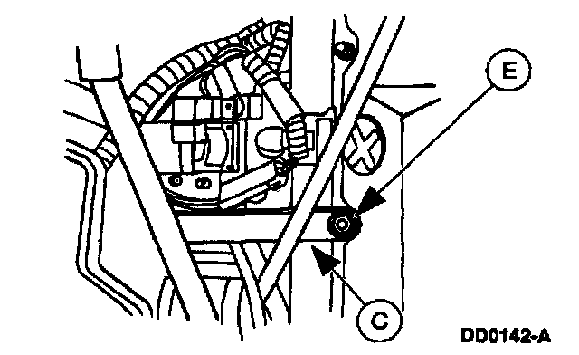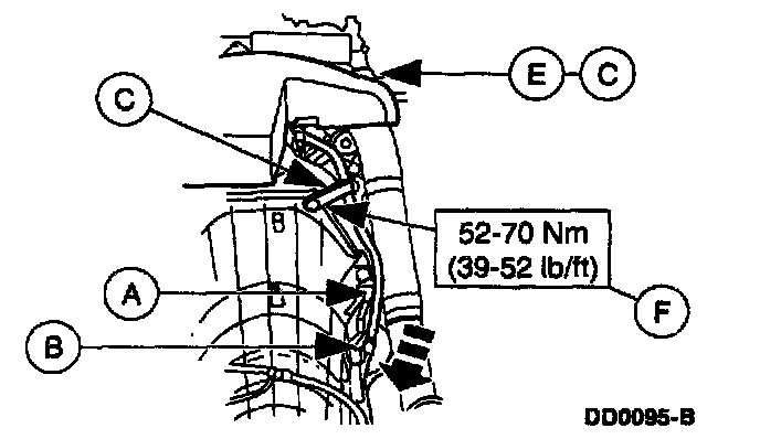 Install the (A) fluid filler tube into the (B) short fluid inlet tube. Position the (C) retaining brackets and install the (E) nut and the (F) bolt.