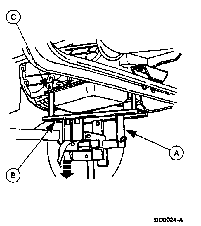 1 Install the (A) transmission support crossmember and the (B) nuts onto the (C) retainer and insulator.