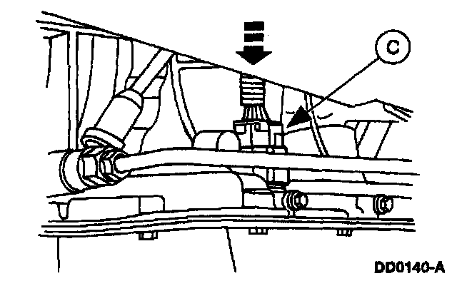 2 Raise the transmission, aligning the (A) transmission support crossmember to the (D) frame.
