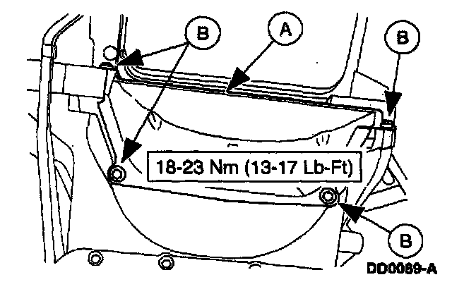 33. Install the (A) flexplate inspection cover and the 5 (B) bolts.