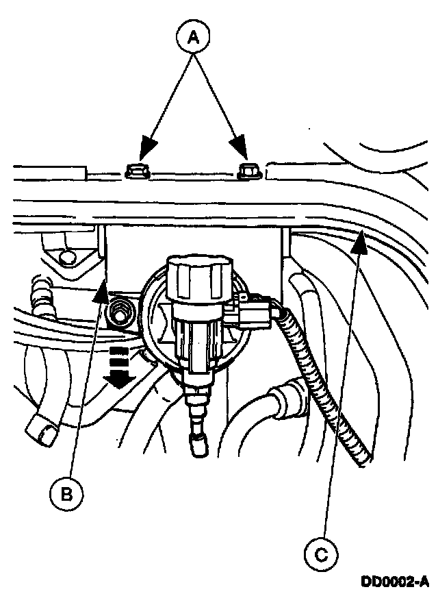 5. Remove the (A) nuts. Separate the (B) vapor management valve assembly from the (C) cowl, and position it aside.