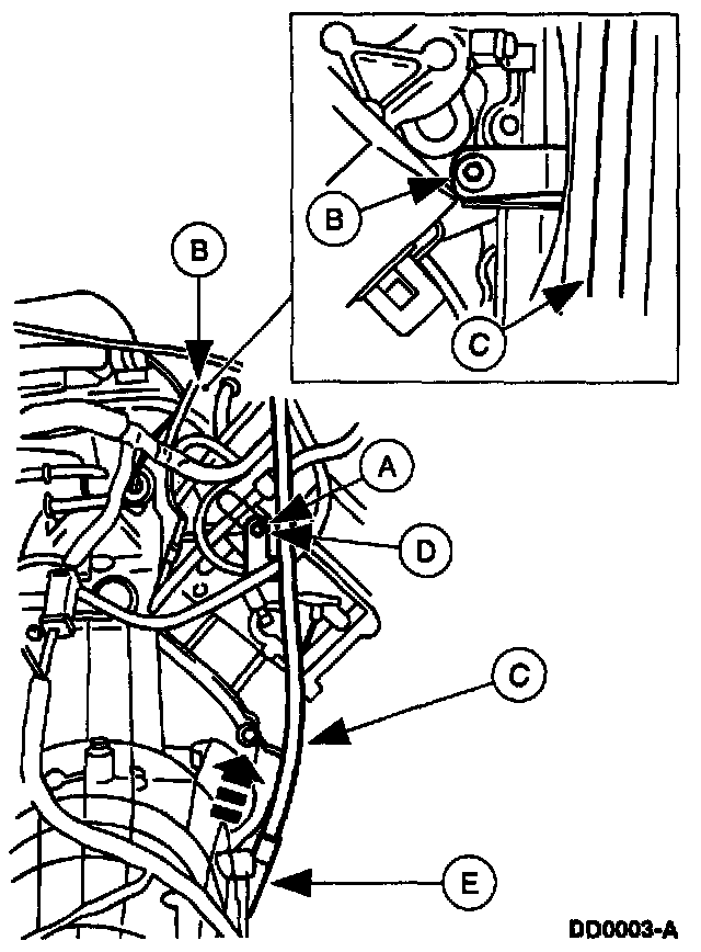6. Remove the (A) nut and the (B) bolt and (D) stud. With a suitable drain pan properly positioned, separate the (C) fluid filler tube from the (E) short fluid inlet tube, and secure it aside.